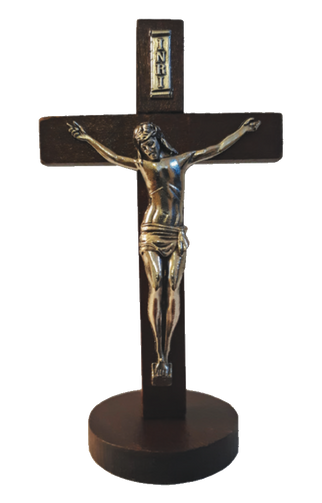 This wood crucifix sits on a round base and measures 4 1/4" in height. It is perfect for your desk or as a gift for a loved one.