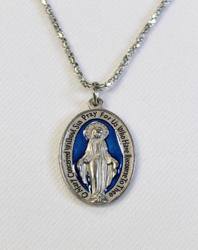 Beautiful 1 and 1/2 inch medal with image of the Miraculous Medal on blue background with a 20 inch chain.