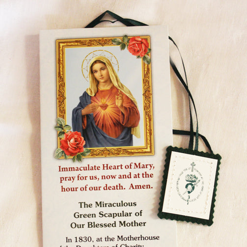 The Miraculous Green Scapular of Our Blessed Mother comes attached to a lovely prayer card (it can be removed).