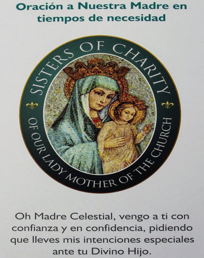 This prayer card contains an image of Mary, Mother of the Church along with a prayer to Our Blessed Mother in time of need.