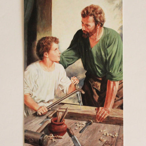 3 1/2" x 7" Prayer Card featuring an image of Saint Joseph and a young Jesus on the front. On the back, you will find a powerful prayer for the intercession of Saint Joseph.