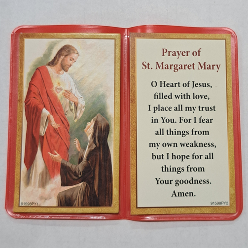 This Sacred Heart vinyl prayer folder holds within it a beautiful image of the Sacred Heart appearing to St. Margaret Mary Alacoque and her Prayer to the Sacred Heart.